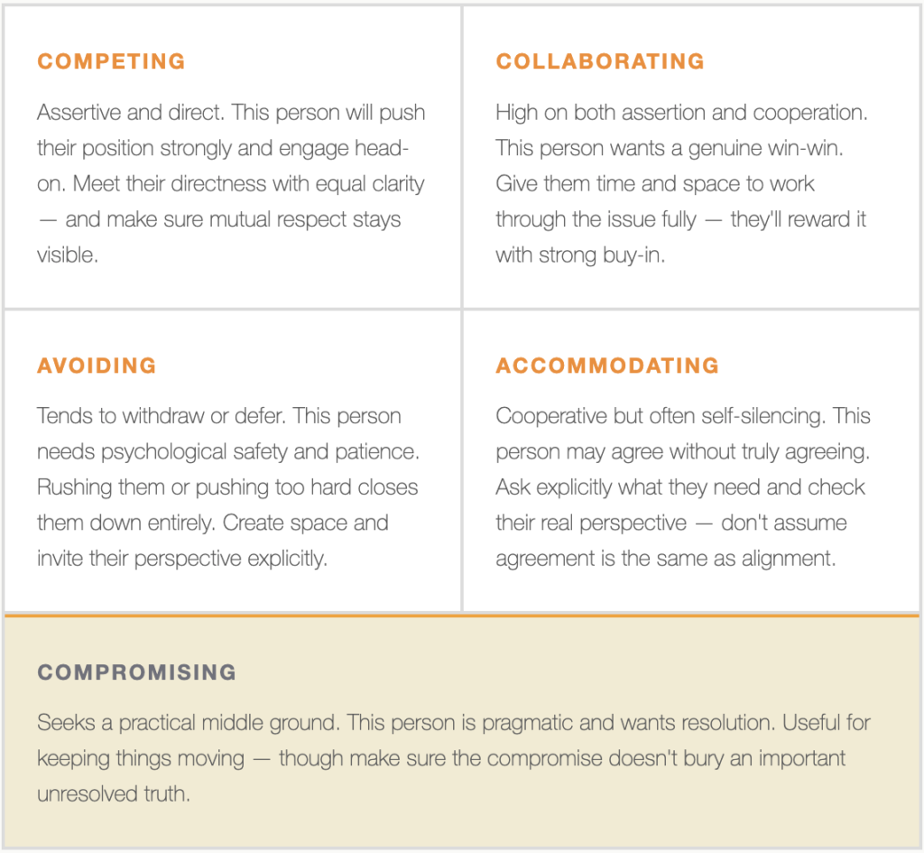 The Thomas-Kilmann Conflict Mode Instrument (TKI) — developed by researchers Kenneth Thomas and Ralph Kilmann — provides a research-validated framework for understanding five distinct ways people respond when conflict arises. Knowing where someone tends to land on this model allows you to adapt your approach, meet them where they are, and dramatically improve the quality of what gets exchanged.